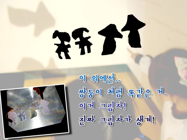 “근데 저기 그림자 방에 가면 또 똑같은 게 나와요. 이거 그림자! 진짜 그림자요!” “이것 봐요. 내 말이 맞죠?” 종이를 OHP위에 올려놓자 진짜 그림자가 벽에 생기고 어린이들은 한참 그것을 바라봅니다. 그러다 이야기 합니다.