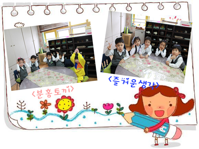 -아직은 자기중심적인 발달단계에 있는 유아들...친구들의 생각을 하나로 모으기란 쉽지 않아요. 하지만 서로를 이해하고 타협하는 방법을 알기 위해 서로의 의견을 이야기 하며 부딪히는 일은 꼭 필요하죠! 우리 꽃잎반은 이런 경험을 나눔으로 통해 한껏 더 성장할 수 있으리라 기대해 봅니다.