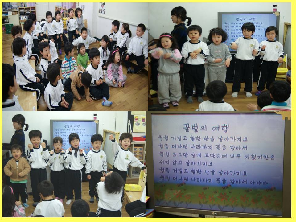 가사를 읽어보며 율동도 친구들과 함께 이야기를 나누며 만들어 보았습니다. “윙윙은 이렇게 해요”, “끝에 ‘야야야’도 해요”, “날아가는 건 이렇게!” 서로 하고 싶은 율동이 다르면 조금 더 마음에 드는 율동에 손을 들어 다수결로 결정합니다. 우리가 만든 율동을 친구들 앞에서 서로 뽐내는 시간을 가졌습니다.