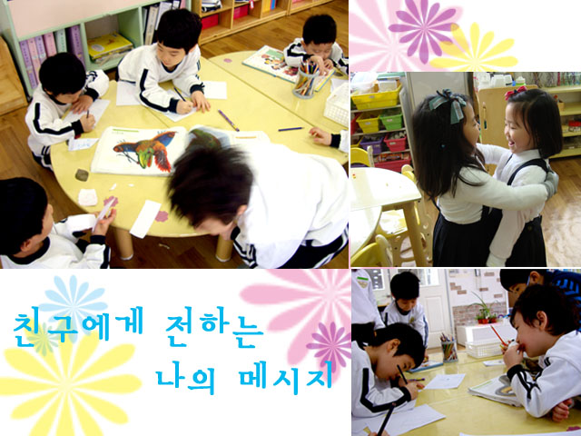 하늘반에는 친구들에게 나의 마음을 전달할 수 있는 메시지 방이 있습니다. 이 메시지 방은 어린이들에게 서로의 마음을 연결시켜 주는 연결고리가 되고 있습니다. 친구에게 자신의 마음을 전하는 일이 익숙하지 않은 어린이들이 자신의 생각, 감정, 느낌을 표현하고자 노력합니다. 물론 처음에는 누구를 위해 쓰기보다는 먼저 그림을 그리거나 글을 적은 다음에 ‘누구에게 줄까~?’를 생각하였습니다. 그러나 시간이 지날수록 친구에 대한 관심이 생겨서인지 어린이들은 그 친구를 위한 편지를 쓰게 되고, 좀 더 친구를 위한 마음이 전해지게 됩니다.