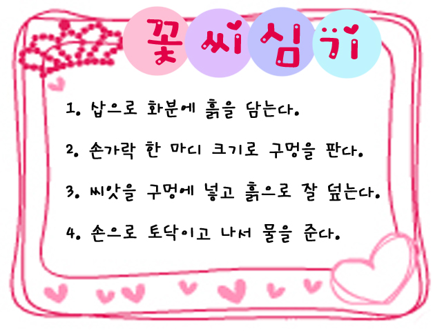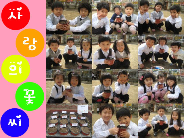 식목일을 맞이하여 꽃잎반 친구들이 꽃씨를 심어보는 활동을 했답니다! 친구와 짝을 지어 화분에 내가 좋아하는 씨앗을 심었어요. 꽃호박, 백일홍, 봉선화, 접시 꽃, 해바라기, 분꽃, 나팔꽃, 강남콩, 쑥부쟁이 씨앗을 심었지요. 하루가 지나고 이틀이 지나고 조금 더 있으면 뽀드득 뽀드득 싹이 나겠죠? 내 짝꿍과 함께 물도 주고, 잡초도 뽑아주기로 약속하면서 우리가 심은 꽃이 잘 자라날 수 있도록 정성껏 돌보아주기로 했어요.