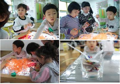 아이들은 탐색의 시간을 통해 재료를 탐색하고, 그 특성에 맞게 활용합니다.