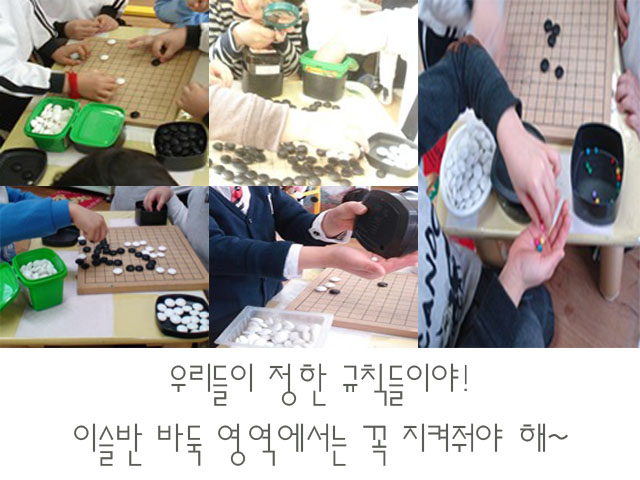 이슬반 친구들은 바둑알과 바둑판을 이용해서 우리만의 규칙을 만들어 가며 바둑놀이를 합니다. 이슬반에서 바둑을 두기 위해서는 다른 어떤 방법과 규칙보다도 이들의 규칙을 이해해야 합니다. 이렇게 놀이방법과 규칙을 바꾸어 가며, <바둑알과 바둑판>을 이용한 새로운 놀이를 만들어 가고 있습니다. 또 어떤 놀이가 개발되어질까요?