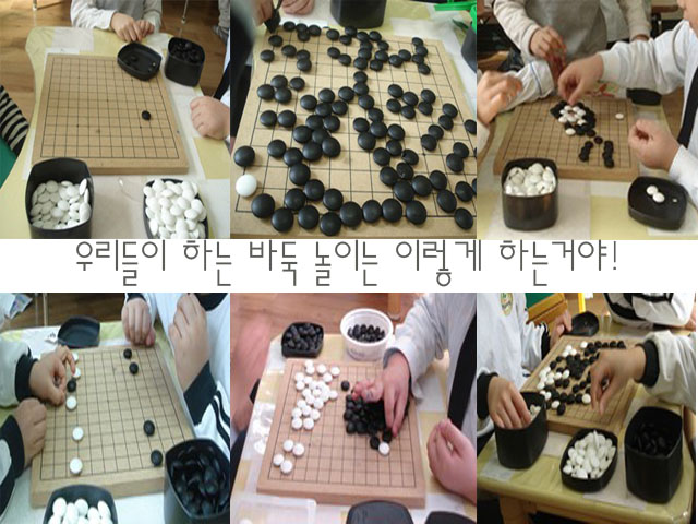 유아: 바둑? 그건 어른들이 하는 놀이 아니야? 유아1 : 아니야! 바둑은 우리들이 해도 되는 거야. 유아2: 알까기해도 되고, 이렇게 바둑알을 가둬두고 다시 가져가는 놀이도 할 수 있고. 유아3: 어른들이 하는 바둑놀이는 어려운건데, 우리가 하는 건 쉬운 거니까 어린이는 누구나 할 수 있어.