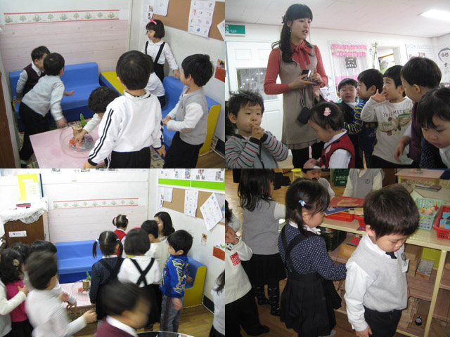 새싹반은 우리 친구들만의 공간입니다. 우리들만의 공간에서 좀 더 안전하고 행복하게 지내기 위해 유아들과 함께 교실에서 지켜야 할 규칙에 대해서 이야기 해 보았습니다. 교사: 우리 교실에서는 어떤 규칙을 지켜야 할까요? 유아1: 뛰지 않아요. 뛰면 다치고 병원에 가야해요. 유아2: 친구를때리지 않아요. 친구가 속상 할 거예요. 유아3: 크게 소리 지르지 않아요. 소리 지르면 너무 시끄럽고 그러면 친구들이 싫어해요.