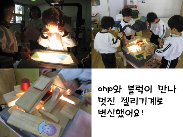 아침마다 진행되는 놀이시간을 유아들은 무척 즐거워 합니다. 그 중 ohp기계에서 빛이 나오는 것을 아이들은 너무나도 신기해 합니다.