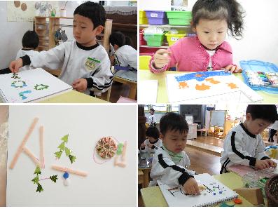 스케치북 위에 크레파스로 써 놓은 내 이름 위에 이리저리 매체물을 놓아보며 어울림직한 순간을 찾아냅니다. 생각만큼 되지 않아 조금 힘들기도 하지만 만족의 순간을 찾아낸 아이들의 표정을 참 밝습니다.
