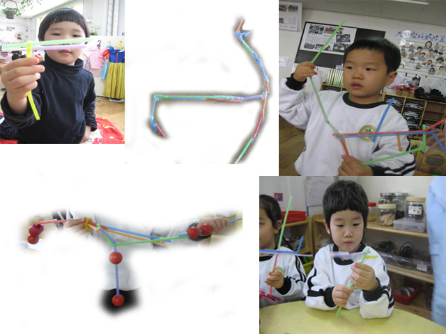조형영역에서 아이들이 가장 관심있어 하는 매체는 <빨대>입니다. 알록달록한 색깔, 빨대의 구부러짐, 일상 속에서 많이 접해본 경험 때문인지 아이들이 친근하게 다가가는 매체 입니다.