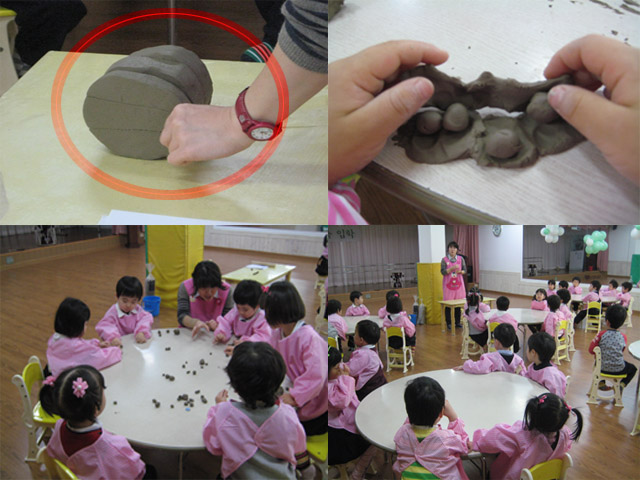 "으악~ 이건 지렁이 같아~하하하" "나는 꽃 만들었어." "이거 만들어서 엄마한테 선물 해야지" "길게 길게 만들 수도 있어요." 찰흙과의 즐거운 만남을 가진 아이들은 멋진 첫 작품을 만들어 보았답니다. 다음 시간에는 어떤 작품을 만들게 될까요? 기대해 주세요.