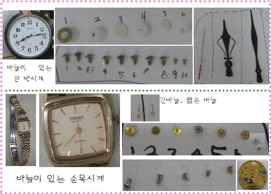 공통점: 긴바늘/ 짧은 바늘/ 초침/ 톱니바퀴/