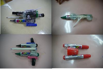 잘 나오지 않는 보드마카를 모아둔 통을 들고 남자 친구들이 테이프를 열심히 붙이며 무언가 만들기를 합니다.