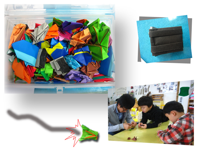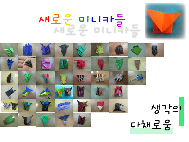 이 말에 오래 전부터 이슬반 친구들은 미니카를 접다가 새로운 모양이 나타나면 선생님께 어김없이 찾아와 사진을 찍어달라고 해왔습니다. 기본 모양에서 다채로운 모양으로 탈바꿈해가는 미니카들. 더욱 멋진 미니카가 나타나면 모두의 자랑거리가 됩니다. 그래서 더 멋지게 접어 자랑하려고 다시 접기도 합니다. 멋진 미니카도 좋지만 정작 시합에서는 빛을 바라지 못합니다.