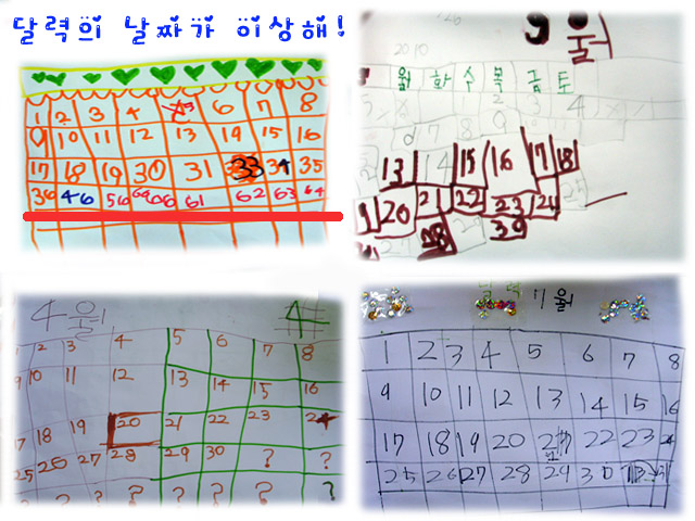 “네~ 알수있어요.” “모를꺼 같은데...왜냐면... 우리가만든 달력은 1일이 월요일이 되어있는데.. 항상 월요일이 1일이 되는 것은 아니예요.” “그래 전부다 1일이 왜 월요일이야?” “어떤 친구들꺼는 요일도 없다!”