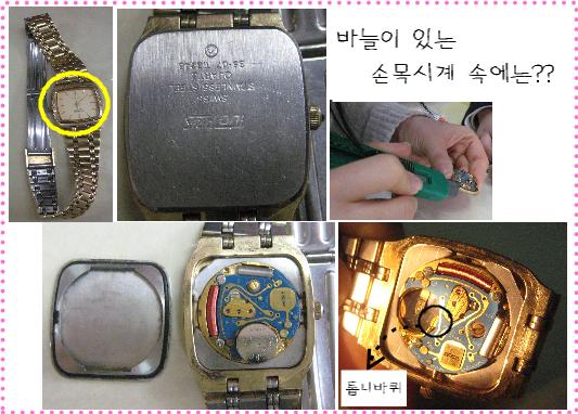 - 함께 공유한 시간에 바늘이 있으면 톱니바퀴가 있을 거라는 아이들의 말에 바늘이 있는 작은 손목시계 속에도 톱니바퀴가 있을지 관찰해봅니다.