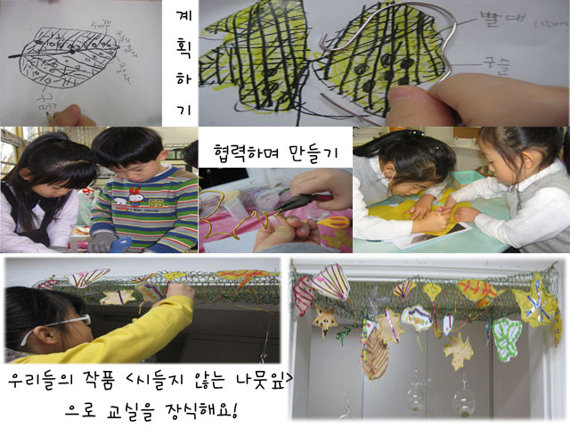 잎새반 유아들은 나뭇잎의 1차표상, 2차표상에 이어 매체와의 만남을 시도하며 나뭇잎을 표현할 수 있는 가장 적절한 매체에 대한 고민을 하게 됩니다. 유아1: 나뭇잎 끝 쪽은 철사로 표현할 수 있을 것 같아요. 철사는 잘 구부러지니까 나뭇잎의 뾰족한 부분도 잘 표현할 수 있을 것 같아요. 유아2: 나뭇잎은 막혀 있으니까 색깔이 있는 종이를 대면 좋겠어요. 유아3: 나뭇잎에 찍혀있는 점은 구슬로 표현할 수도 있을 것 같아요. 유아들은 자신의 나뭇잎을 가장 잘 표현할 수 있는 적절한 매체를 선택해 나뭇잎을 표현하기 시작합니다. 두 개의 철사를 연결하기 위해 합쳐서 꼬기도 하고, 다양한 매체들과 도구를 활용하여 나뭇잎의 모습을 표현해 나갑니다.그리고 여러번의 시행착오 끝에 나뭇잎을 완성합니다. 유아4: 빵끈 가운데 철사가 들어있는게 잎맥과 비슷해요. 그래서 빵끈으로 잎맥을 표현했어요. 유아5: 철사가 단단해서 연결하는게 조금 힘들었어요. 유아6: 목공풀을 사용해서 구슬을 붙이려니 자꾸 떨어져서 글루건을 이용해서 붙였어요. 유아7: 연필로 종이에 그림을 그릴 때 보다 매체를 사용하니깐 나뭇잎을 더 다양하게 표현할 수 있어서 재미있었어요. 유아7: 우리가 만든 나뭇잎 잘 보이는 곳에 전시해 두고 계속 보면 좋겠어요! 그렇게 해서 나뭇잎은 잎새반 자료실 입구를 예쁘게 장식하게 되었답니다. 잎새반 유아들은 매체로 표현하는 과정을 통해 더 다양한 매체를 탐색해 보고 활용할 수 있게 되었을 뿐만 아니라 매체 마다 가지는 성질과 한계점까지 파악할 수 있는 소중한 경험을 하게 되었답니다.<유치원 vs 초등학교>