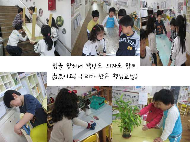 교사: 어떤 것들을 좀 더 바꾸면 좋을까?"높은 책상이 많이 필요해요! 낮은 책상을 높은 책상으로 바꾸면 좋을 것 같아요. 모두가 앉으려면 의자도 더 필요해요." 이야기 나눈 끝에 도예영역과 편지영역의 낮은 책상을 바꾸기로 하고 유아들과 함께 책상과 의자를 옮겨 잎새반 교실을 조금씩 변화시켜 봅니다. 유아들: 초등학교랑 조금 비슷해 진 것 같아요! 그럼 여기는 잎새 초등학교?