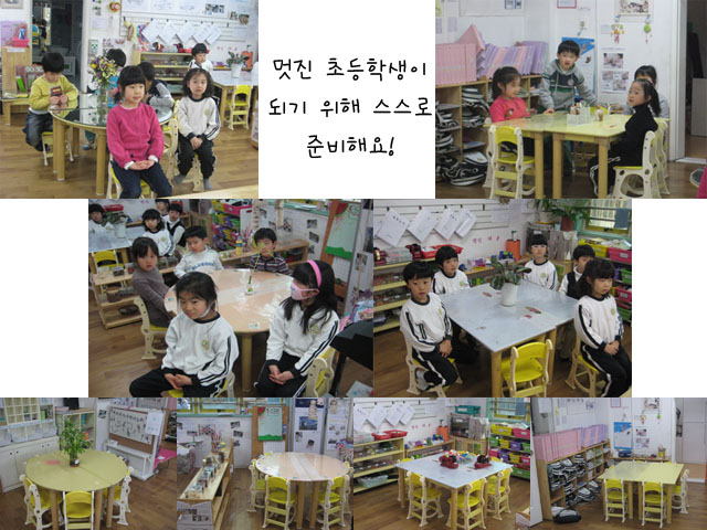 교사: 초등학교과 유치원은 어떤 점이 다를까요?유아1: 칠판이 더 커요. 유아2: 책상도 많고 의자도 많아요. 유아3: 놀이 할 수 있는 영역이 없어요. 교사: 초등학교라는 조금은 낯선 환경에서 적응을 잘 할 수 있도록 잎새반 공간을 초등학교 처럼 조금 변화시켜 보면 어떨까? 유아들: 좋아요!