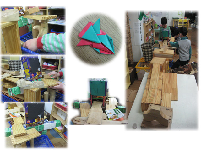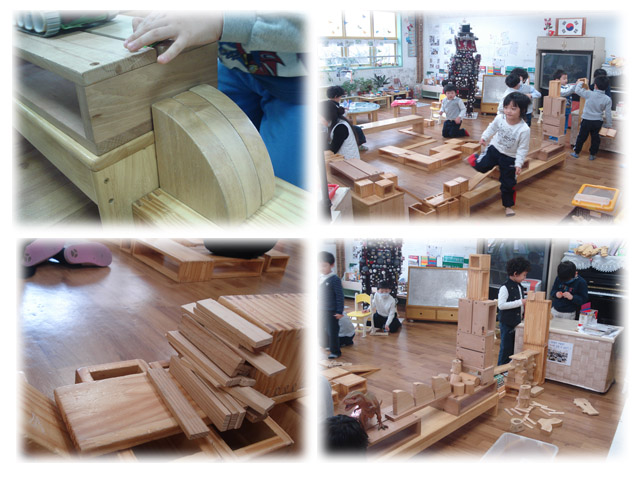 더 많은 아이디어도 나타납니다. 큰 블록으로만 하다 작은 블록, 카프라, 심지어 매체물까지도 활용하게 됩니다. 길이 만들어지면서 다음날, 그 다음날엔 똑같은 길이 하나 없고 전에 했던 부분들을 응용하여 새로운 길을 만듭니다. 그리고 뚝딱뚝딱 소리가 끊임없이 흘러나옵니다. 유아: 선생님. ‘공사중’ 표지판 꺼내주세요! 교사: 어디에 쓸려구요? 유아: (흐믓한 표정으로)공사하고 있잖아요~