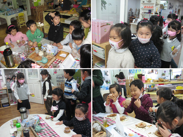 겨울이 되어서 찻집을 찾는 친구들이 더 늘어나고 있어요. 이제는 하늘반 친구들뿐 아니라 다른 반 친구들도 하늘반 찻집으로 차를 마시러 온답니다. 친구들이 한꺼번에 몰려들 때는 줄을 세워야하고, 차를 우려내고 내어주는데 시간도 많이 걸려요. 친구들이 기다리는 동안 <언제까지 기다려야 해? 다식도 먹고 싶어! 만들어 줘!> 이렇게 불평도 하고 요구도 한답니다. 놀이 시간에 찻집을 하는 친구들은 놀이 시간이 끝나고 나면 <휴우~>하고 안도의 한숨을 내쉬지만 다음날이 되면 또 찻집을 계획한답니다. 곁에서 지켜보는 동안 <무엇이 이 아이들에게 힘들지만 계속해서 찻집을 열게 만드는 힘일까?> 라는 의문을 갖게 만듭니다.차를 마시고 난 아이들은 <아~ 따뜻해. 마음도 따뜻해 지는 것 같아. 맛있어! 잘 먹었어! 또 올께!> 라는 말을 남기고 다시 활동을 하러 갑니다. 찻집을 하는 아이들은 친구들이 호호~ 불어가며 차를 마시는 모습, 차를 마시고 나서 뒤돌아 가는 모습도 흐뭇하게 지켜봅니다. 아마 우리 어머니들께서 맛난 음식을 정성스레 준비해주시고 맛있게 먹는 모습에서 힘들지만 보람을 찾는 그런 기분을 우리 아이들도 느끼고 있는게 아닐까요?