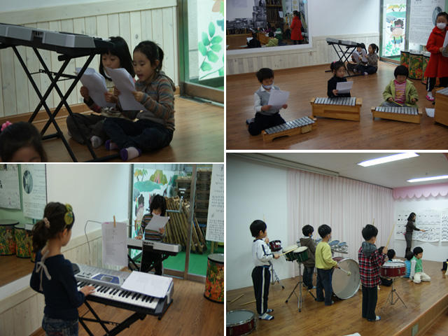 멜로디 팀은 <도도 미미 솔솔 미~> 악보를 받고 열심히 외우고, 타악기 팀은 <쿵 짝짝짝~> 박자를 외우고 있답니다. 처음에는 그저 계이름과 박을 보고 읽기 바빴던 친구들이 조금씩 악기로 표현할 수도 있게 되었답니다. 친구들을 많이 응원해 주세요~# OHP 빛놀이
