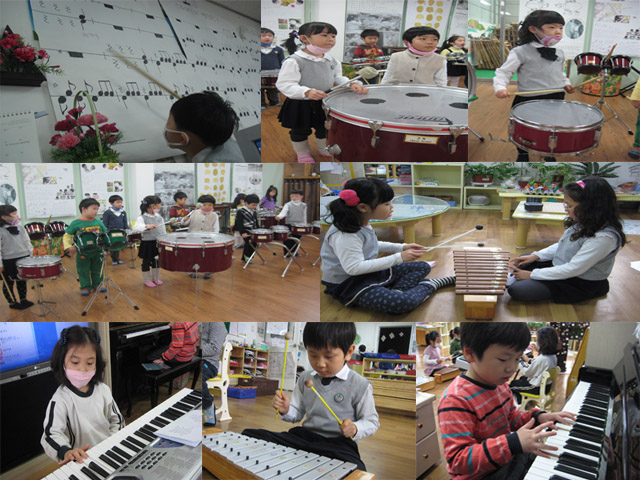 이제 노래에 맞추어 손과 발을 이용해 박자를 맞추어 보고, 계이름으로 노래를 불러봅니다. 그리고 멜로디에 자신이 있는 친구와 리듬에 자신이 있는 친구로 나누어 연습을 시작합니다. 큰북, 트리오 드럼 등 타악기를 두드려 보고, 다양한 종류의 실로폰을 쳐 보면서 각각 다른 소리를 탐색합니다. 다양한 악기가 모여 만들어내는 아름다운 음악을 기대해주세요.#수화&핸드벨 팀