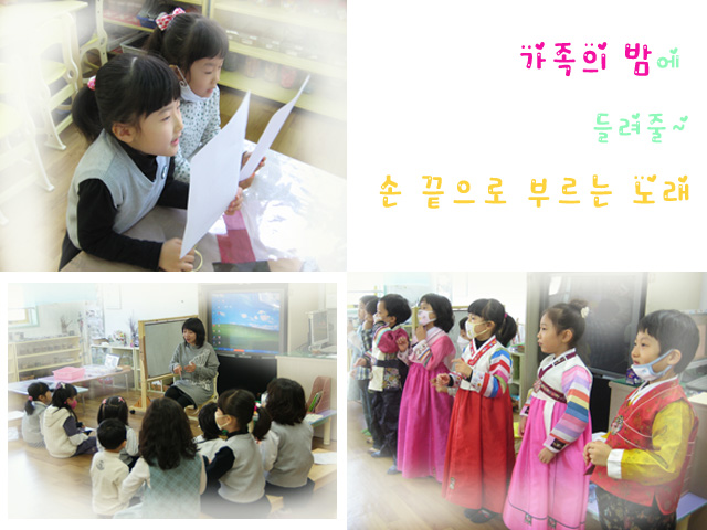 16명의 천사들이 가족의 밤을 위해 함께 노래 부르고 함께 호흡을 맞추어 봅니다.아이들의 표정에서 설레임 과 기쁨을 보아요. 매일 교실에서 보던 얼굴과 복도에서 마주치던 얼굴들이 만나니 들뜬 마음은 두 배가 되었어요. 우리는 먼저, 가족의 밤 무대에 올릴 노래를 정했어요.