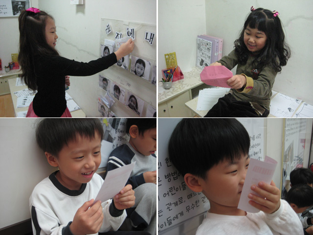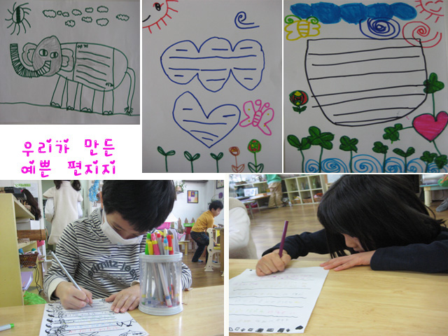 하늘반에는 <메세지 센터>가 있어요. 이곳에는 친구들에게 쓴 편지를 주고 또 받을 수 있는 공간이랍니다.친구에게 쓰고싶은 편지지도 아이들이 스스로 디자인해 보고 그것을 복사해서 다양한 편지지가 마련되어 있어요. 이제는 매일 다른 친구에게 편지를 쓰면서 내가 친했던 친구 또 더 가까워지고 싶은 친구들에게도 편지를 써 봅니다. <사랑해, 나랑 친구하자, 싸우지 말자> 등의 내용으로 시작했던 편지 내용이 점차 <너랑 같은 반이 되어서 기뻐, 우리 오늘 어느 영역에서 같이 놀까? 너랑 더 친해지고 싶어, 전에 화나게 만들어서 미안해>등의 좀 더 가까이 나의 마음을 전하고 있어요. 아이들은 나의 편지함을 들여다보며 편지를 기다리고 또 두근거리는 마음으로 편지를 읽어가고 있답니다. 편지를 통해 우리 아이들이 좀 더 사랑하는 마음과 행복한 마음 그리고 표현력까지 더 자라나길 기대해 봅니다.