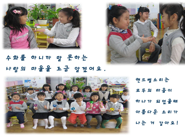 <핸드벨> 핸드벨을 처음 접한 유아들은 핸드벨의 아름다운 선율에 마음이 빼앗긴듯 보입니다. "아름다운 소리예요." "소리가 여름처럼 맑고 쨍쨍 한거 같아요" 도 레 미..나만의 계이름이 정해지고 낮은 도 부터 높은 도 까지 흩어져 있던 마음이 하나로 모이는 순간 <도레미송> 노래가 완성 됩니다.기대해주세요~!