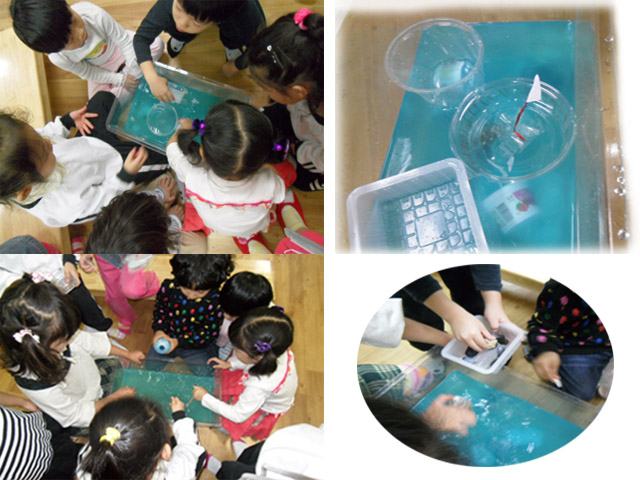 아이들이 만든 수조 속 작은 바다가 배 놀이를 즐겨하는 아이들에게 흥미로운 경험을 제공해 줍니다.