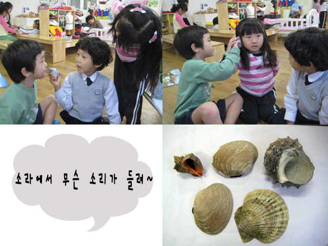 이렇게 하여 아이들은 수조 속을 진짜 바다처럼 꾸며보기로 하였답니다. 며칠 동안 수조를 꾸밀 재료를 가져오고 아침부터 서둘러 수조를 꾸미기 위해 모두 모였답니다. “파란 물감을 섞어서 바다색을 만들자.” “음..그런데 바다는 파란색도 있지만 조금 초록색도 있어.” “그래 맞다.” “그 다음은 조개를 넣어주자.” “퐁당~~” “난 조개 먹어본 적 있는데~” “바다에 가면 불가사리도 있어.” “어? 그런데 소라에서 이상한소리가 나.” “어디?? 들어보자.”소라를 귀에 대고 한참을 들여다 보던 아이들은 하나같이 소라에서 신기한 소리가 들린다고 합니다. “어?.. 바다소리 같아.” “난 윙윙하는 소리.” “난 휘휘~하는 소리 같은데~”