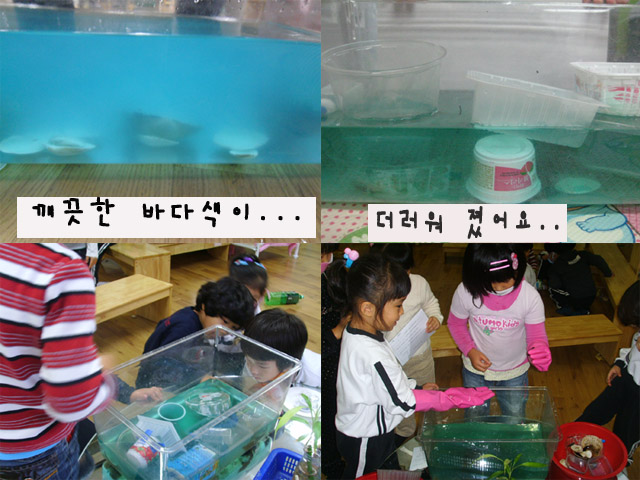 바다 물을 만들어 놓고 수족속의 물은 하루가 다르게 탁해져 갑니다. 변해가는 수조속의 물을 보면서 아이들은 어떤 생각을 할까요?