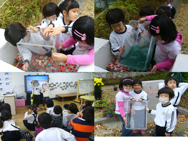 “수조에서 이상한 냄새가 나요.” T: 어떤 냄새가 나는 것 같니? <오줌 냄새, 똥냄새, 먼지 냄새, 이상한 냄새, 소주 냄새, 식초냄새, 막창냄새> T: 그런데 수조에 있는 물이 왜 더러워졌을까? “우리가 물속에 이상한 것을 다 넣어서 수조가 더러워졌어요.” “물을 너무 오랫동안 놔둬서 물이 더러워 졌어요.” T: 이렇게 더러운 물을 보고 그냥 두었니? "배(배가 위에 있어서) 때문에 물이 더러운 줄 몰랐어요. “너무 냄새가 나니까 씻었으면 좋겠어요.” “맞아 우리가 수조를 깨끗이 씻자. 그러면 냄새도 안날거야.” “좋은 생각이야.”수조 속은 오랫동안 놓아둔 플라스틱과 각종 조개와 먼지로 가득 차 있었답니다. 수조를 깨끗이 하기 위해 아이들은 먼저 큰 플라스틱을 골라냅니다. “통에서 너무 이상한 냄새가 나.” “윽~~ 우리가 왜 이제 알았을까..” 수조를 깨끗이 씻고 나니 아이들의 표정 까지 밝아졌답니다. “우와~ 진짜 깨끗해 졌어.” “이제 냄새도 안 나는 것 같아.”