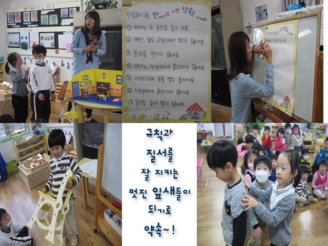 유치원에서 안전하게 생활하기 위해 어떤 것들을 지켜야 하는지 디오라마 자료를 통해 알아보고 필요한 규칙에 대해 생각해 보는 시간을 가졌습니다. 교사: 유치원에서 지켜야 하는 규칙에는 어떤 것들이 있었죠? 유아1: 쌓기영역에서 블록을 쌓을 때 머리 위로 쌓지 않아야 해요. 유아2: 머리 위로 높이 쌓고 싶으면 친구들이 많이 다니지 않는 곳으로 쌓으면 안전할 수 있을 것 같아요. 유아3: 그렇게 하면 블록도 잘 넘어지지 않고 친구들도 다치지 않을 것 같아요. 유아4: 의자를 옮길 때는 두 손으로 옮겨야 해요. 등받이와 의자를 잡고 옮기는 것이 안전해요.유아5: 물건을 던지지 않아요. 유아6: 지난번에 친구가 카프라를 총알이라고 하면서 던져서 맞을 뻔 한 적이 있어요.유아7: 카프라는 딱딱하기 때문에 맞으면 피가 날 수도 있기 때문에 위험해요. 유아8: 복도와 계단에서는 봉을 잡고 걸어 가야 해요. 복도와 계단은 함께 사용하는 공간이기 때문에 다른 사람에게 방해가 되어서는 안돼요. 유아9: 식당에서도 뛰어선 안돼요. 뛰면 먼지가 많이 나서 음식 뿐만 아니라 우리 입이나 코로도 들어갈 수도 있어요. 모두가 잘 알고 있는 교실, 복도, 계단, 식당 등 유치원 안의 다양한 장소에서 지켜야 하는 규칙과 예절이지만 <안전교육> 시간을 통해 그 규칙들을 잘 지키고 있는지 점검해 보고, 다시 한번 마음에 새길 수 있는 기회를 갖게 되었답니다. 앞으로도 유치원에서 지켜야 하는 예절을 잘 지켜 잎새반 친구들 모두 안전하고 행복하게 생활할 수 있길 바래 봅니다.<스케치북에 가을을 담다..>