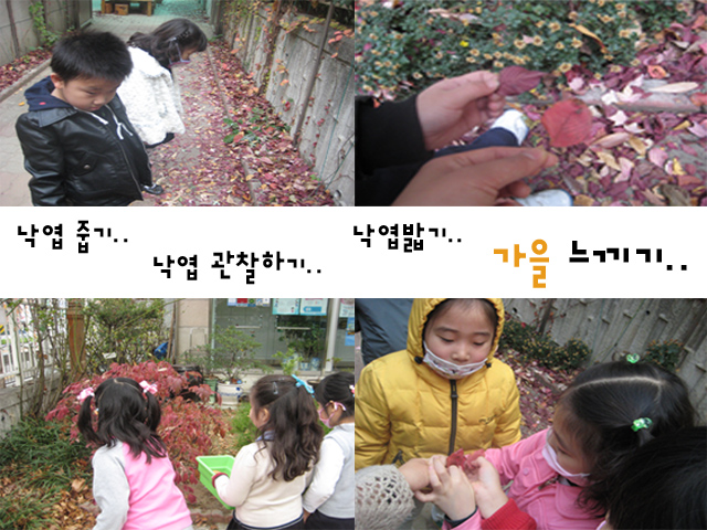 유아들은 <날씨> <나뭇잎 색>의 변화 등 주변의 다양한 것들을 보며 가을이 왔음을 느낍니다.그 중 가을의 변화를 가장 잘 나타내어주는 단풍잎으로 여러가지 표현을 시도 해 봅니다.