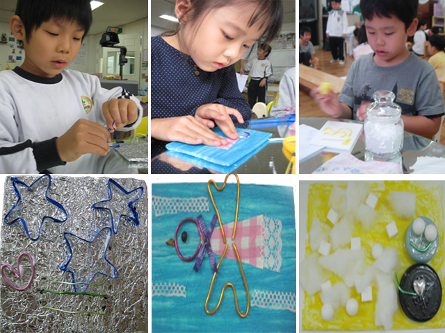 상민: 나는 반짝거리는 하늘을 만들고 싶어요. 여기 터널 속으로 통과하려고 별들이 모이고 있어요. 상민이는 평면에 입체를 표현하려는 생각을 처음으로 한 친구예요. 철사로 터널을 만들고 예쁜 별들을 만들어 주었네요.