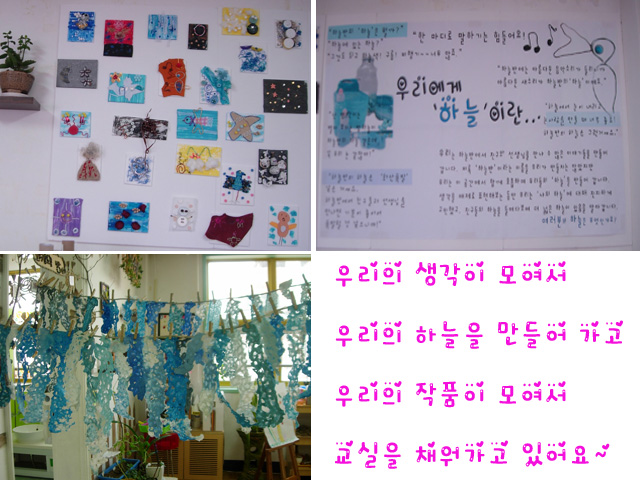 아이들의 생각이 작품으로 만들어지고 그에 대한 과정을 패널로 만들어서 공유하고, 전시회 때부터 이어서 <하늘>이라는 주제에 대해 우리는 계속해서 생각하고 있답니다. 생각이 작품으로 변하고 작품은 끝임없이 하늘반의 환경을 변화시켜가고 있어요.
