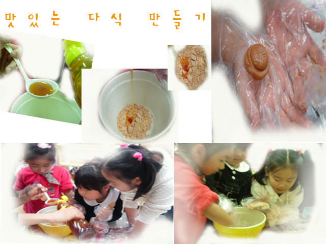 유아1: 차하고 다식 먹고 싶다~ 유아2: 유치원에 엄마 왔을 때 처럼 다식 만들고 싶어요~ 차 하고 같이 팔꺼예요. 교사: 그래? 선생님은 어떤 것들을 준비해줄까? 유아3: 콩가루랑 초청이랑 같이 섞을 주걱이랑.. 유아4: 그릇도 있어야 돼요. 꿀도 약간요. 뚝딱뚝딱 준비한 재료들을 가지고 다식만들기를 시작합니다.유아5: 엄마랑 같이 해봤을때 초청을 너무 많이 넣어서 반죽이 잘 안 됐어요. 손으로 다 조물조물하면 안되고, 적당히 떼서요. 조물조물하다가요. 동글동글하게 말아서요. 모양을 찍으면 돼요. 원장님께서 준비해 주신 반죽으로 다식 만들기를 해본 적은 있지만, 이렇게 어른의 도움없이 다식을 만들어 보기는 처음이었어요.어머니께서 다식 반죽을 만드시는 것 본적이 있는 아이들은 조물조물 야무지게 잘도 만듭니다. 자~ 이제 완성!!