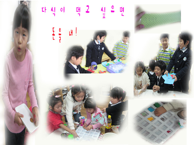 유아6: 찻집에 놀러 오세요~~ 차와 함께 다식도 먹을 수 있어요. 유아7: 와~ 맛있겠다. 나도 죠! 유아8: 안돼~!! 다식이 먹고 싶으면 돈을 들고 와! 유아7: 나는 돈 없는데... 유아9: 만들면 되지.무조건 숫자를 많이 적어서 큰 돈을 만드는 친구가 있는가 하면 나름대로의 규칙을 정해서 돈을 만들기도 합니다. 유아8: 만원 짜리는 초록색! 천원 짜리는 파랑색 하하~ 유아9: 오천원 짜리는? 유아10: 오천원짜리는 노란색으로 하면 되지~ 유아11: 야~ 그것만 있는 줄 아나~ 오만원짜리도 있다!! 유아12: 오만원짜리는 무슨 색으로 하지?; 유아9: 그냥 주황색하자! 이렇게 하늘반 친구들은 오늘도 맛있는 차와 다식을 나누어 먹었답니다.