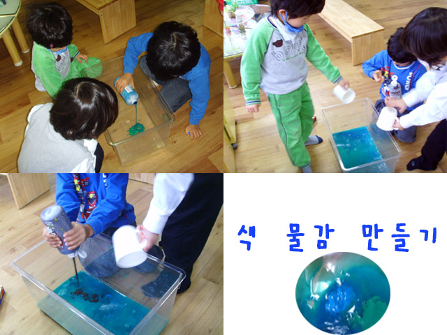 지난시간 깨끗이 씻은 수조를 보면서 아이들은 다시 색 물 만들기에 몰입합니다.