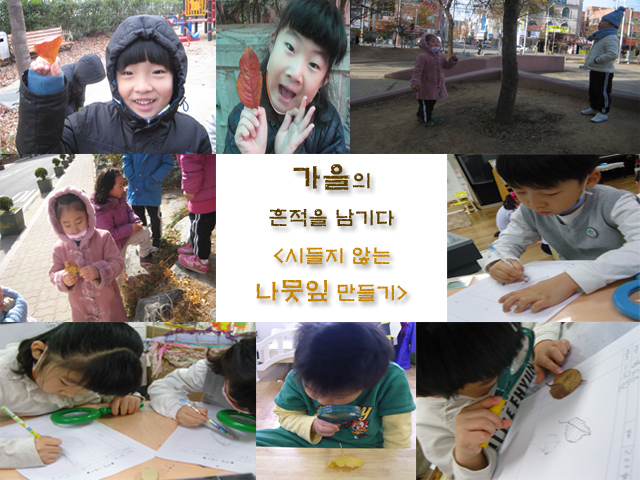 유아1: 유치원 주변에 있는 나무가 달라졌어. 여름에는 잎도 많고 초록색이었는데 노란색으로 변했다가 이제는 많이 떨어졌어. 유아2: 겨울이 되려고 하면 왜 나뭇잎이 떨어지는 걸까? 유아3: 바람이 세게 부니까 떨어지는 것 아닐까? 유아4: 나무에 그대로 붙어 있는 나뭇잎은 힘이 센가 보다. 바람에도 끄떡없는 걸 보니까! 유아5: 봄이 되면 예쁜 꽃도 피고 잎이 또 다시 많이 생겨나겠지? 유아6: 이것 봐! 지난번에 봤을 때는 낙엽이 부드러웠는데 이젠 말라서 부서져. 교사: 이 낙엽은 곧 있음 마르고 부서지지만 시들지 않고 계속해서 볼 수 있는 나뭇잎을 우리가 만들 수 있지는 않을까? 유아7: 아! 그림으로 그려서 표현할 수 있겠어요! 유아8: 거기에다 색칠을 하면 더 나뭇잎 같을 것 같아요.유아9: 나뭇잎을 자세히 보면 잎맥이 많잖아요? 그건 철사로 표현하면 쉬울 것 같아요. 가을의 아름다운 흔적을 계속해서 남겨두고 싶은 마음에 잎새반 유아들은 시들지 않는 자신들만의 나뭇잎 만들기를 계획합니다. 자신이 표현하고 싶은 나뭇잎을 선택하고, 나뭇잎을 관찰하며 새로운 특징들을 발견해 나가게 됩니다.