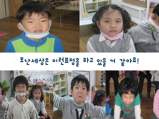 작은 가슴가슴 마다 고운 사랑 모아~우리 함께 만들어가요 아름다운 세상~♬ 잎새반 친구들은 <아름다운 세상>이라는 노래를 무척 좋아한답니다. 그렇다면 유아들이 생각하는 <아름다운 세상>은 어떤 세상일까요? 유아1: 저는 사람들이 병에 걸리지 않아 건강하고 환경오염이 되지 않는 세상이 아름다운 세상이라고 생각해요. 유아2: 사람들이 예쁘고 멋진 미래를 갖는다면 좋은 생각만 할 거 같아서 아름다운 세상이 될 거 같아요. 유아3: 꽃과 나비가 많고 나무들이 쑥쑥 자라는 세상이요. 유아4: 제가 생각하는 아름다운 세상은 사람들이 행복하게 사는 세상이예요. 유아5: 저는 사람들이 공부도 잘하고 똑똑한 세상이 아름다울 거 같아요. 유아들은 그들만의 <아름다운 세상>을 그리며 한걸음 더 가까이 다가갑니다.그렇게 이야기를 나누던 도중 갑자기 한 유아의 목소리가 들립니다."선생님 이건 네모난 세상이에요!" 라고 말하며 무서운 표정을 지어 보입니다. 이어 몇명의 유아들도 모난 세상을 표정으로 표현 해 봅니다. 그러자 이번엔 "이건 둥근세상이에요" 라고 말하며 둥근세상을 표현 합니다."둥근세상은 어떤 세상이니?" 유아6: 둥근 마음은 친구들과 놀 수 있는 마음이에요. 유아7: 같이 공놀이 할 수 있는 마음이에요. 유아8: 반쪽이 두명이 합체하는 마음이에요.유아9: 사랑하는 마음이 점점 모여서 둥글게 되는 거 같아요. 유아들은 다양한 방법으로 세상을 표현 합니다. 아름다운 세상을 만들기 위해 우리 잎새반 친구들이 할 수 있는 것에 어떤 것들이 있을까요? 앞으로 잎새반 유아들이 만들어갈 세상은 아름다운 세상이길 바래 봅니다.