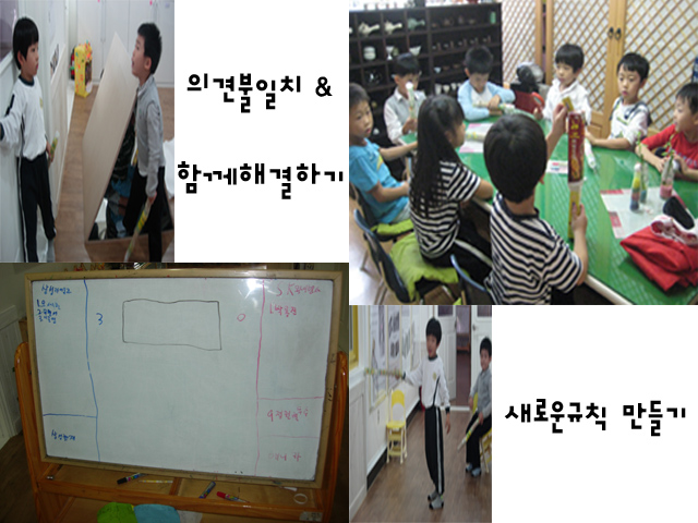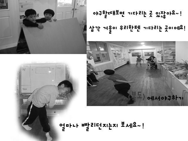 교실 안에서 이루어지는 야구놀이에 대해 문제를 제기하는 유아들이 하나 둘 생겨납니다."야, 방망이에 맞았다." "너무 시끄러워" 교실에서 야구놀이가 이루어지는 것에 대한 한계를 야구놀이를 하는 유아들도 느끼기 시작합니다. "너무 좁아요. 선생님" 야구놀이를 하기에 적합한 장소를 찾아봅니다. "아! 복도가 좋을 거 같아요. "복도는 길고 넓잖아요." <복도>에서 야구를 하는 것에 모두 동의한 유아들은 교실에 있던 칠판을 복도로 빼내어 놀이 준비를 시작합니다. <복도>라는 공간에서 새롭게 시작된 야구놀이는 보다 더 활성화 됩니다.복도에 있는 작은 피아자 삼각거울 뒤에서 경기를 지켜보는 유아들. "여기 기다리는 곳이데~야구할때 보면 기다리는 곳 있잖아요. 거기에요.""야, 타자가 왜이렇게 가까이 있는데? 타자는 여기 선에서 치는걸로 하자." "칠판 뒤로 공이 넘어가면 홈런이다!" "그리고 타자는 세번 동안 칠수 있데~" 옮겨진 장소에 맞게 다양한 규칙을 정하면서 유아들은 놀이를 점점 구체화 시켜 나갑니다. "야구경기 보면 1루 2루 3루 이런건도 있잖아. 그리고 투수는 왜 한명이야?" "우리는 그냥 공을 쳐서 날려요. 그리고 투수는 한 명만 있어도 되요" "삼성은3명이고 SK는 한명이네?" "니 SK해라!" "절대싫어! 난 원래 삼성이야" SK를 유난히 싫어하는 유아들. "그럼 팀 이름 바꾸자" "아~그럼 난 기아" "KRE...아니다. KEA.. 아 그냥 우리말로하자! 기아!" 팀을 정할 때 일어나는 의견 불일치를 해결해나가는 과정을 거치며 그들만의 야구놀이를 탄생시키고 놀이를 즐기기 시작합니다. 교실에서 <복도>로 장소가 변경되면서 야구놀이는 또 어떻게 변해 가게 될까요?