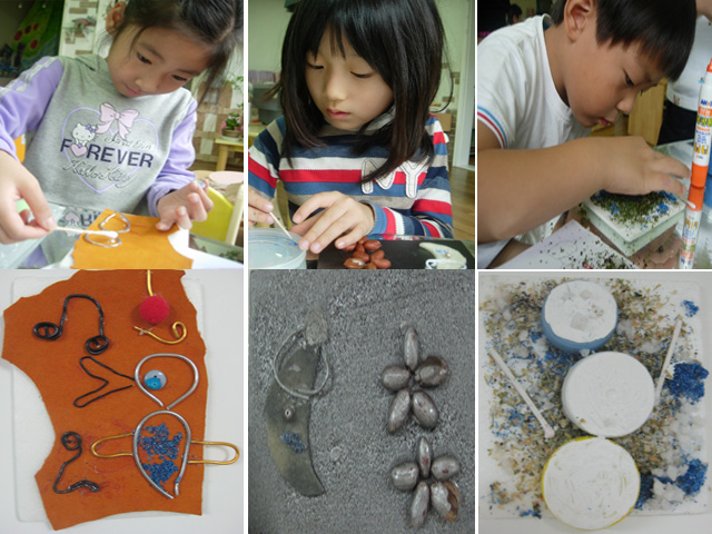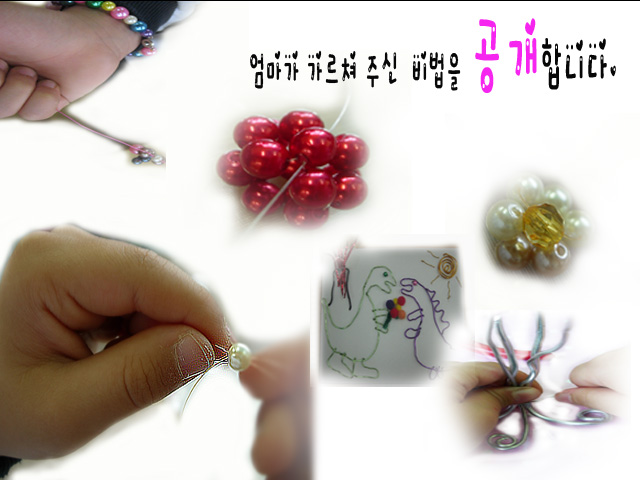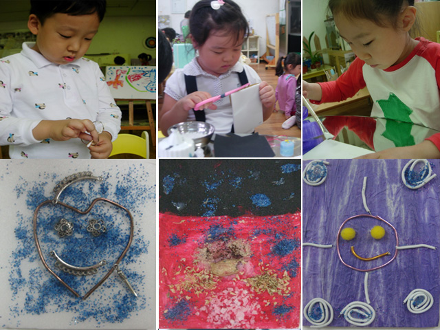 민서: 하늘하면 파란 얼굴이 생각나요. 하트같은 얼굴~ 민서는 악세사리를 만드는 재료로 웃고 있는 모습을 만들고 색모래를 뿌려 마무리 합니다.