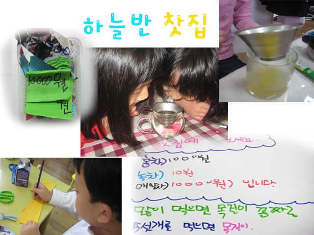 엄마와 함께 자유선택활동을 한 후, 아이들은 새로이 알게 된 비법을 전수하느라 놀이시간이 더욱 즐겁게 느껴집니다. 알록달록 반복되는 색깔 패턴으로, 또 모양 패턴으로 능숙하게 구슬을 꿰던 아이들에게 새로운 도전의 과제가 생겼어요. 구슬로 모양을 만들면서 꿰는 방법인 <교차>를 배우게 되었구요. 목공용풀을 사용하지 않고도 철사를 붙이는 방법과 바닥을 고정하지 않아도 철사를 세울 수 있는 방법도 알게 되었어요. 이렇듯 엄마와 함께 한 자유선택활동은 또 다른 나의 자랑거리가 되었답니다. 구슬철사영역에서는 또 어떤 작품이 완성될까요? 그리고 도예, 조형, 쌓기, 음률영역에서는 또 어떤 비법이 전수되고 있을까요? 우리 아이들의 업그레이드 된 활동을 기대해 봅니다^^<선생님~ 보온병에 따뜻한 물 받아주세요>라고 방긋 웃으며 찻집을 찾아요. 홍차, 녹차, 보이차, 레몬차, 아이스티까지.. 향과 맛을 음미하고 내 몸이 따뜻해 지는 기운을 느끼면서 하루일과를 시작합니다. 하늘반 찻집은 어느때 보다 놀이시간이 가장 분주하지요. 놀이를 하다가도 잠시 들리면 맛있는 차를 맛 볼 수 있기 때문이예요. 맛있는 차를 대접받은 친구들은 답례로 자기가 만든 선물을 주기도 하고 음악연주를 들려주기도 했어요. 그런데 어느새 색종이에 100원, 1000원, 10000원의 지폐를 만들어서 차값으로 지불하는 아이들이 생겨났어요. 전단지를 보고 다른 반 친구들도 찻집에 찾아와요. 유아1: 하늘반 찻집으로 오세요. 올때 돈도 들고 와야해. 햇살유아1:그런데 500원짜리는 작은 네모로 만들어야 돼? 하늘반 찻집에서 찻값을 낼 때는 어떤 돈을 내야 할까요? 점점 고민스러워 질 것 같네요^^