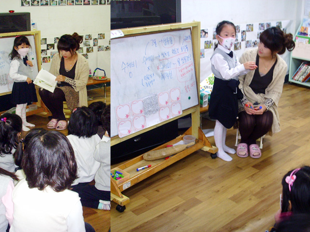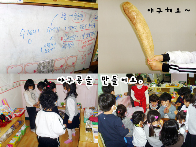 “우리가 지난번에 수세미가지고 설거지 해보고 싶다고 했잖아요.” T: 근데 왜 하지 않았어? “어~그건요. 설거지를 하려니깐 할께(씻을게) 없잖아요.” “그러면 우리가 집에서 그릇을 가지고 오자.” “아니~ 한림유치원에 깨끗하지 않은 그릇으로 씻으면 되잖아.” “설거지 하려면 거품나는 것도 있어야 되잖아. 퐁퐁인가...락스라고 하는거 말이야!” “근데 난 집에서 그릇 가지고 오기 싫은데” “그럼 게임으로 해서 정하자.”“어떤 게임?” “수세미가 야구 방망이 같이 생겼으니깐 야구게임해서 이기는 사람 마음대로 정하기로 하자.” “근데 야구공이 없잖아.” “공은 우리가 신문지로 만들면 되잖아.” “제 생각은 찌직찌직거리는거로 빨대로 후 ~~ 부는거로해요.(스티로폼 공) 왜냐면 신문지는 테이프 때문에 거칠거칠해서 친구 얼굴에 치면 거칠거칠할 것 같아요.” “야구? 난 야구 못하는데~~ 으~ 여자는 야구 못해..” “옛날에 어떤 소녀시대에 윤아가 야구프로그램에 나왔는데 공을 던졌는데, 윤아가 공을 쳤어요.” “그래 여자도 야구를 할 수 있어”