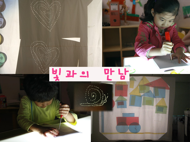 “나는 우리 반에서 했던 빛 달팽이 만드는 게 제일 재미있었어.”“난 송곳으로 구멍 뚫는 게 재미있었는데~” “난 달팽이 말고 자동차도 만들어봤어.” “난 OHP위에 매체물 올리고 그림자놀이 하는 게 재미있었어.”