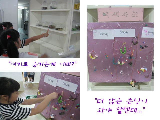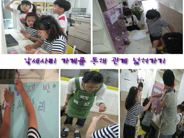 그렇게 해서 유아들은 악세사리 가게를 교실에서 복도로 옮겨 활동을 진행해 나가게 됩니다. 복도에서 악세사리를 만드는 유아들에게 이제는 친구들과 동생들 뿐만 아니라 영어 선생님, 도예 선생님, 조리사님까지 관심을 보이네요.