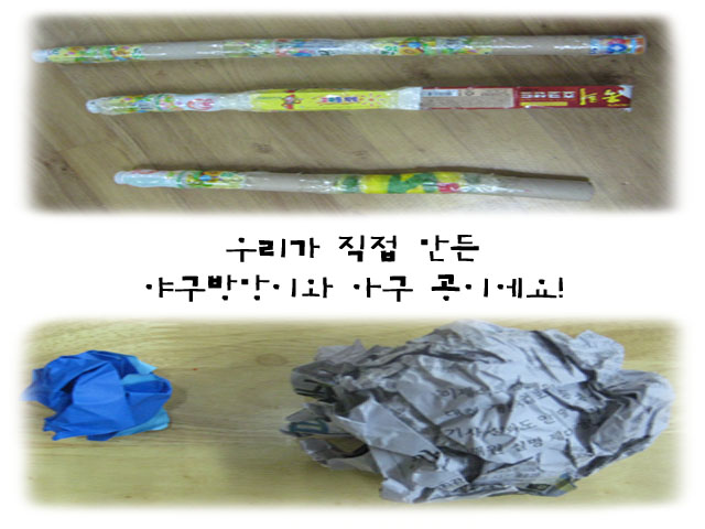 잎새반에는 지금까지 없었던 새로운 놀이가 탄생하였습니다. "우리 야구 할꺼에요!" 하며 유아들은<야구>놀이를 계획하고 진행해 나갑니다. 먼저 휴지싱과 요쿠르트병을 이용하여 긴 야구방망이를 만들고 신문지를 동그랗게 구겨 야구공으로 변신 시킵니다. 교사: 왜 신문지를 구겨 공을 만들었어? 유아1: 다른 종이로 하면 빳빳하게 되지만 신문지는 잘 구겨지고 부풀어 올라서 잘돼요. 스스로 선택한 매체로 자신이 원하는 놀잇감을 만들어내는 모습도 보이네요. 유아2: 선생님, 나 좀 보세요. 나 공 멀리까지 날려 보내 볼게요. 한손으로 공을 던지고 또 한손으로는 야구방망이를 휘둘러 멀리까지 날려보냅니다. 교사: 우와~ 정말 잘하네! 공을 쳤을 때 느끼는 희열감을 유아는 환한 미소로 답해 줍니다. 교사: 그런데 너희들은 야구를 왜 하는 거야? 유아: 야구선수가 되려면 열심히 연습해야해요.