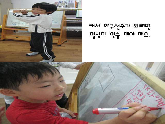 혼자서 공을 던지고 방망이를 휘두르며 공을 치는 형태에서 더 많은 유아들이 관심을 가지고 모이기 시작하면서 야구놀이는 서로 공을 던져주고 치는 형태로 바뀌어 갑니다. 그리고 야구놀이에 필요한 다양한 역할을 만들어 가기도 합니다. 유아1: 야 니는 1번타자 나는 2번타자 데이~ 유아2: 나는 투수다. 다양한 문구 또는 약자를 적으며 자신들의 역할을 칠판에 적어나갑니다. 교사: p가뭐에요? 유아4: 투수에요. 그리고 야구장에 가면 네모도 그려져 있고 삼성화재 이런 것도 적혀 있어요. 유아들은 <야구>에 대한 지식과 경험을 떠올리며 자신들만의 놀이로 만들어 갑니다. 꿈을 위해 시작된 야구놀이! 앞으로 어떤 방향으로 꿈을키워 나갈지 기대해주세요.
