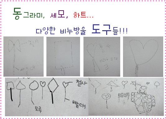 교사: 비누방울 도구를 우리가 직접 만들어 볼 수 있을까? 유아1:할 수 있어요! 빨대에 우유 고리를 붙이면 되잖아요. 유아2: 빨대를 가위로 자르면 되잖아요 교사: 우유 고리가 아닌 모양을 동그라미 세모 네모 모양으로 만들 수는 없을까? 유아2: 음...철사로 하면 되요. 유아3: 철사를 구부려서 하면 되요. 유아4: 빨대를 구부려서도 할 수 있어요. 유아5: 뾰족하면 비누방울이 터진다. 뾰족하지 않게 만들어야 되요. 교사: 그럼 우리가 만들 비누방울 도구를 어떤 재료를 이용해서 만들 건지 그림으로 그린 후에 만들어봐요!